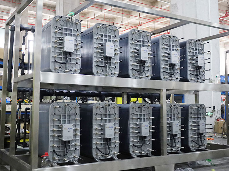 EDI膜堆主要由交替排列的阳离子交换膜、浓水室、阴离子交换膜、淡水室和正、负电组成。在直流电场的作用下,淡水室中离子交换树脂中的阳离子和阴离子沿树脂和膜构成的通道分别向负和正方向迁移,阳离子透过阳离子交换膜,阴离子透过阴离子交换膜,分别进入浓水室形成浓水。同时EDI进水中的阳离子和阴离子跟离子交换树脂中的氢离子和氢氧根离子交换,形成超纯水(高纯水)。超电流使水电解产生的大量氢离子和氢氧根离子对离子交换树脂进行连续的再生。传统的离子交换,离子交换树脂饱和后需要化学间歇再生。而EDI膜堆中的树脂通过水的电解连续再生,工作是连续的,不需要酸碱化学再生。