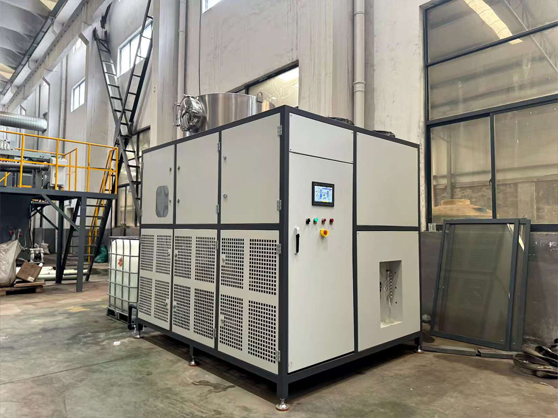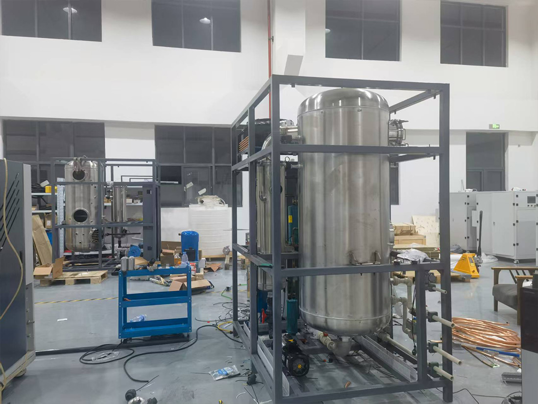 2) 低温蒸发器 废液进入低温蒸发器,在较低温度下蒸发,蒸汽排出经降温冷凝形成蒸 馏水,浓水回到集水吨桶或者委托外单位处理。可去除重金属,大部分 无机盐。低温蒸发设备是利用降低容器压力(真空状态),使得容器中 的废水沸点降低至 30-45℃。加热制冷部分使用热泵技术,压缩机启动 对氟利昂做功,热的氟利昂通过蒸发釜内置盘管跟乳化液废水进行换热, 乳化液废水开始沸腾,废水中的水分在低温状态下沸腾,蒸汽经过低温 冷凝处理变成蒸馏水(产水)。特别推荐用于处理多种污染废水或含油 产品的水,尤其是来自切削液废水、清洗废水、表面处理废水、高盐废 水、探伤检测废水或其他生产过程用水等等。